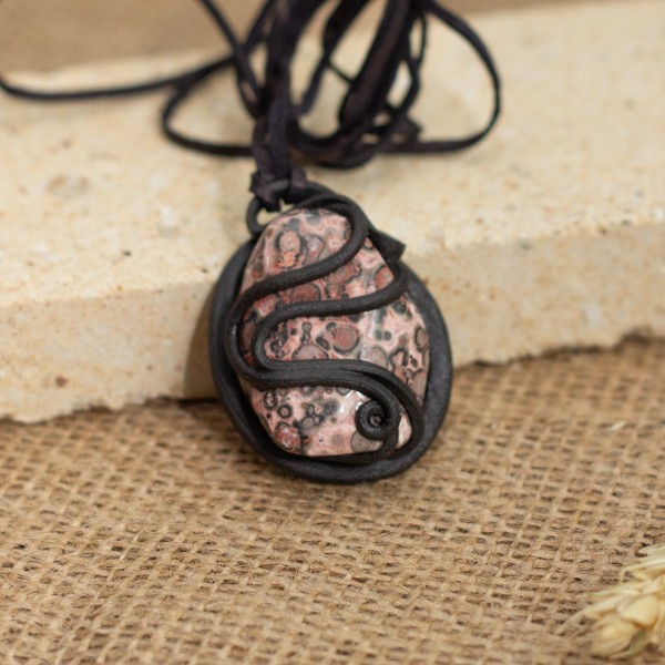 Autorský přívěsek s jaspisem. Černo-hnědá pryskyřice vytváří jemné obepnutí s křivkami a spirálami, které zdůrazňují kontrast kamene. Velikost přívěsku je přibližně 4-6cm.