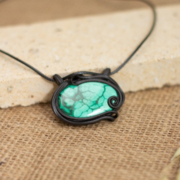 Přívěsek velký-amulet s malachitem, kdy dominantou přívěsku je kámen o velikosti 4-6cm. Přívěsek je zavěšen na bužírce s nastavitelným zapínáním. Hmota je pružná, velice odolná, lehká, odolná vůči vodě a potu. Vhodná pro alergiky.