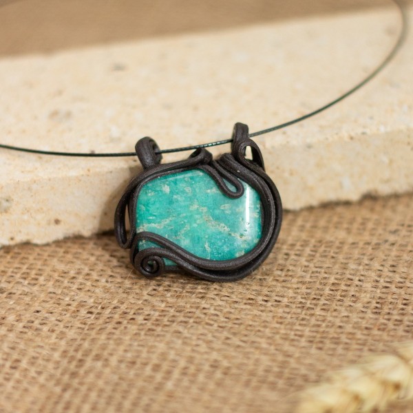Přívěsek velký-amulet s amazonitem, kdy dominantou přívěsku je kámen o velikosti 4-6cm. Přívěsek je zavěšen na bužírce s nastavitelným zapínáním. Hmota je pružná, velice odolná, lehká, odolná vůči vodě a potu. Vhodná pro alergiky.