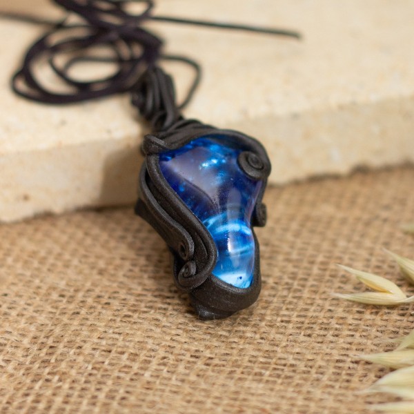 Ručně tvarovaný přívěsek s hladkým modrým sklem, které se třpytí při každém pohybu. Asymetrický tvar a spirálové detaily dodávají šperku dynamiku. Šperk je uvázán na kožené šňůrce cca 80-90cm dlouhé.