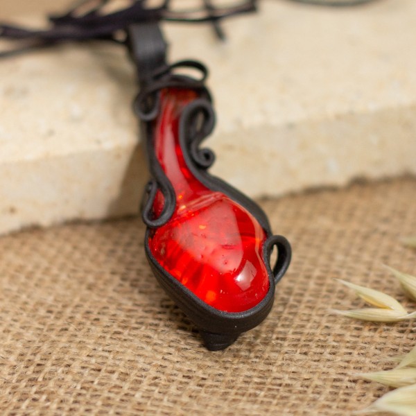 Ručně tvarovaný přívěsek s hladkým červeným sklem. Asymetrický tvar a spirálové detaily dodávají šperku dynamiku. Šperk je uvázán na kožené šňůrce cca 80-90cm dlouhé.