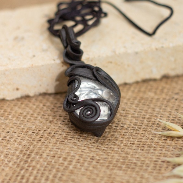 Ručně tvarovaný přívěsek s hladkým bílám sklem se stříbrnými odlesky, které se třpytí při každém pohybu. Asymetrický tvar a spirálové detaily dodávají šperku dynamiku. Šperk je uvázán na kožené šňůrce cca 80-90cm dlouhé.