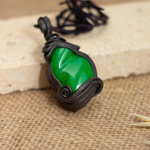 Ručně tvarovaný přívěsek s hladkým zeleným sklem. Asymetrický tvar a spirálové detaily dodávají šperku dynamiku. Šperk je uvázán na kožené šňůrce cca 80-90cm dlouhé.