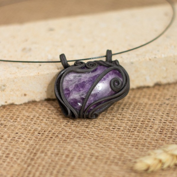 Přívěsek velký-amulet s ametystem, kdy dominantou přívěsku je kámen o velikosti 4-6cm. Přívěsek je zavěšen na bužírce s nastavitelným zapínáním. Hmota je pružná, velice odolná, lehká, odolná vůči vodě a potu. Vhodná pro alergiky.
