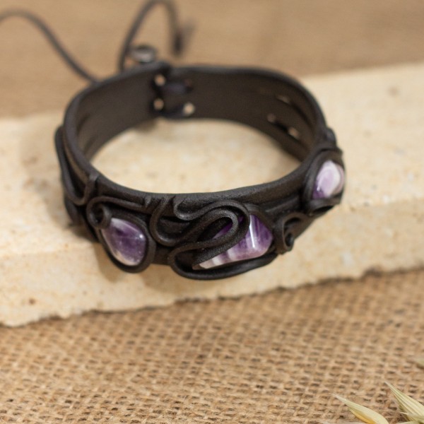 Autorský náramek s přírodním ametystem. Tmavé rámování z pryskyřice nechává vyniknout čistotu kamene a dodává šperku moderní kontrast. Snadné zapínání se šněrováním.