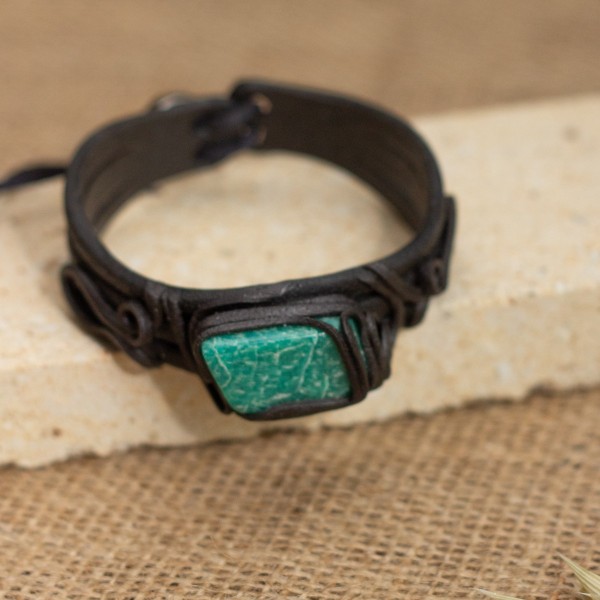 Autorský náramek s přírodním amazonitem. Tmavé rámování z pryskyřice nechává vyniknout čistotu kamene a dodává šperku moderní kontrast. Snadné zapínání se šněrováním.