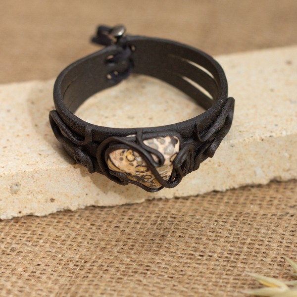 Autorský náramek s přírodním jaspisem. Tmavé rámování z pryskyřice nechává vyniknout čistotu kamene a dodává šperku moderní kontrast. Snadné zapínání se šněrováním.