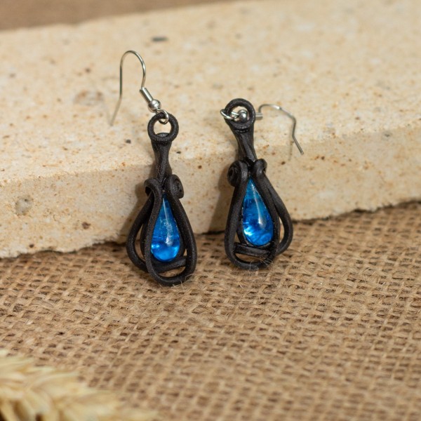 Visací náušnice z umělecké pryskyřice s modrými skleněnými kapkami. Hmota je pružná, imituje kůži, odolná vůči vodě. Vhodná pro alergiky. Velikost náušnic bez kovodílu je 1,5 až 3cm.