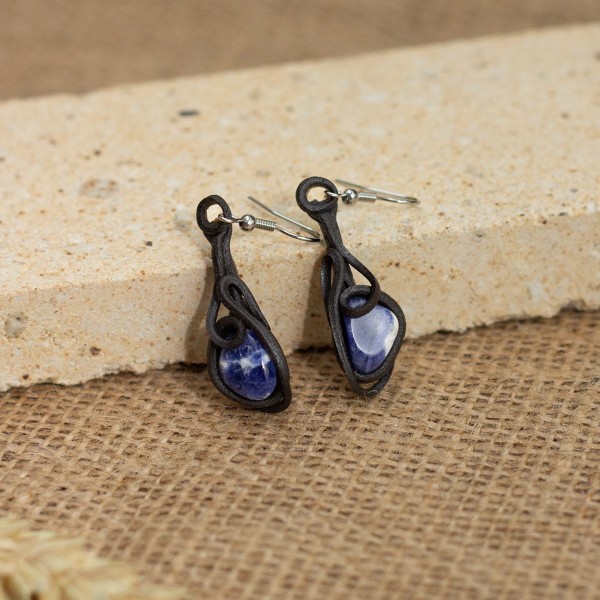 Visací náušnice z umělecké pryskyřice se sodalitem. Hmota je pružná, imituje kůži, odolná vůči vodě. Vhodná pro alergiky. Velikost náušnic bez kovodílu je 1,5 až 3cm.
