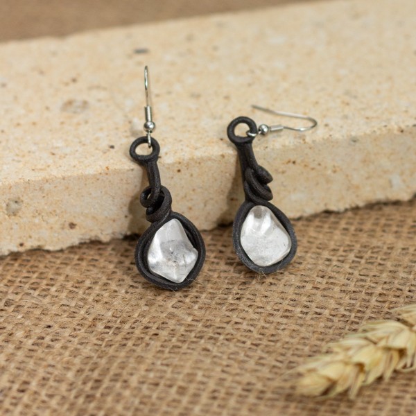 Visací náušnice z umělecké pryskyřice s křišťálem. Hmota je pružná, imituje kůži, odolná vůči vodě. Vhodná pro alergiky. Velikost náušnic bez kovodílu je 1,5 až 3cm.
