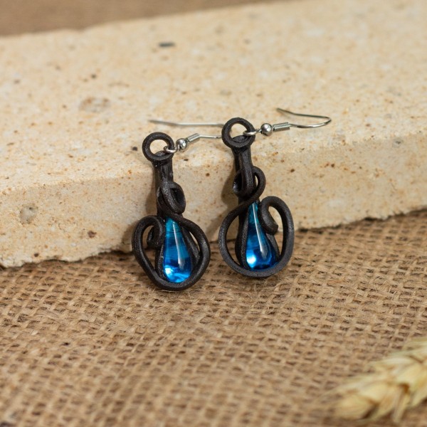 Závěsné náušnice z umělecké pryskyřice s modrými skleněnými kapkami. Hmota je pružná, imituje kůži, odolná vůči vodě. Vhodná pro alergiky. Velikost náušnic bez kovodílu je 1,5 až 3cm. Výrazné a přitom elegantní.