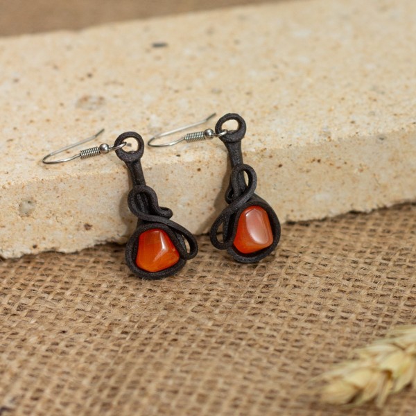 Visací náušnice z umělecké pryskyřice s karneolem. Hmota je pružná, imituje kůži, odolná vůči vodě. Vhodná pro alergiky. Velikost náušnic bez kovodílu je 1,5 až 3cm.