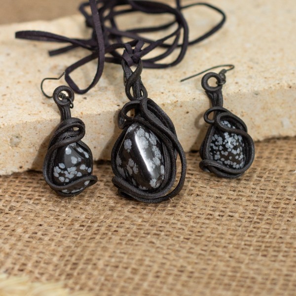 Sada přívěsku a náušnic z umělecké pryskyřice stejného tvaru s obsidiánem. Hmota je pružná, imituje kůži, odolná vůči vodě. Vhodná pro alergiky. Velikost náušnic bez kovodílu je 1,5 až 3cm. Přívěsek je 4-6 cm veliký, uvázán na kůži dlouhé 80-90 cm.