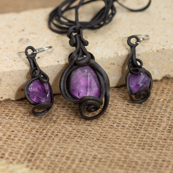Sada přívěsku a náušnic z umělecké pryskyřice stejného tvaru s ametystem. Hmota je pružná, imituje kůži, odolná vůči vodě. Vhodná pro alergiky. Velikost náušnic bez kovodílu je 1,5 až 3cm. Přívěsek je 4-6 cm veliký, uvázán na kůži dlouhé 80-90 cm.