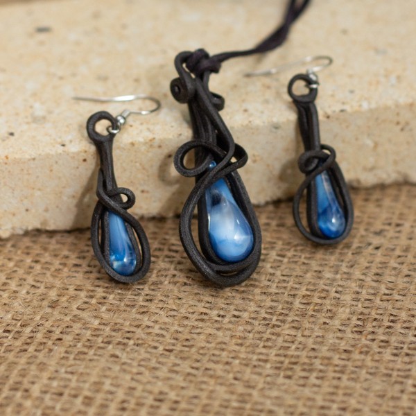 Sada přívěsku a náušnic z umělecké pryskyřice stejného tvaru s modrými kapkami. Hmota je pružná, imituje kůži, odolná vůči vodě. Vhodná pro alergiky. Velikost náušnic bez kovodílu je 1,5 až 3cm. Přívěsek je 4-6 cm veliký, uvázán na kůži dlouhé 80-90 cm.
