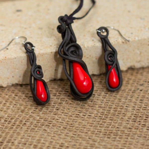 Sada přívěsku a náušnic z umělecké pryskyřice stejného tvaru s fialovými skleněnými kapkami. Hmota je pružná, imituje kůži, odolná vůči vodě. Vhodná pro alergiky. Velikost náušnic bez kovodílu je 1,5 až 3cm. Přívěsek je 4-6 cm veliký, uvázán na kůži dlouhé 80-90 cm.