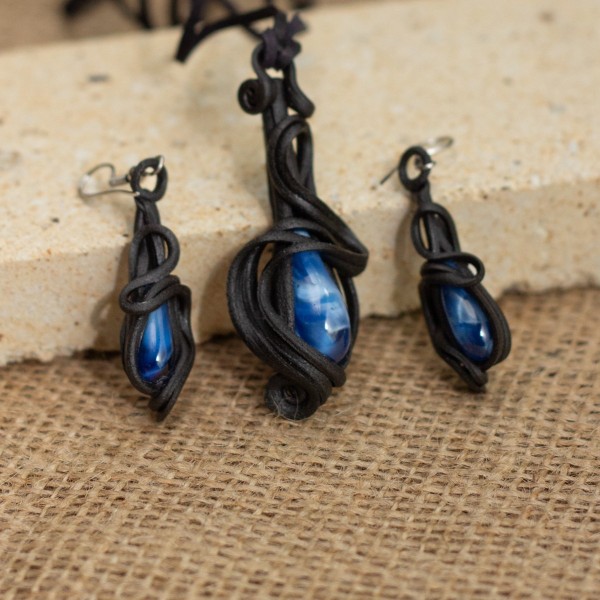 Sada přívěsku a náušnic z umělecké pryskyřice stejného tvaru s modrými skleněnými kapkami. Hmota je pružná, imituje kůži, odolná vůči vodě. Vhodná pro alergiky. Velikost náušnic bez kovodílu je 1,5 až 3cm. Přívěsek je 4-6 cm veliký, uvázán na kůži dlouhé 80-90 cm.