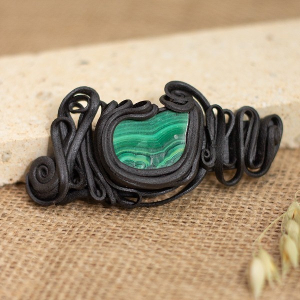 Spona do vlasů s malachitem z umělecké pryskyřice a kovovým mechanismem o velikosti 8cm. Celková velikost spony je přibližně 10cm.