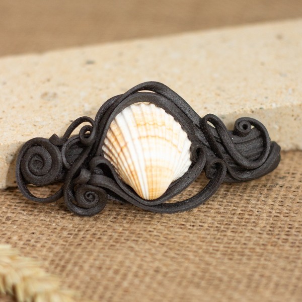 Designová spona do vlasů o velikosti 10cm s mušlí. Černo-hnědá pryskyřice vytváří dynamické vlny, které kameny propojují do harmonického celku.