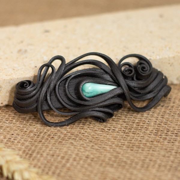 Designová spona do vlasů o velikosti 10cm se sklem. Černo-hnědá pryskyřice vytváří dynamické vlny, které kameny propojují do harmonického celku.