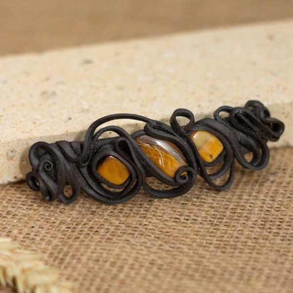 Designová spona do vlasů o velikosti 10cm s tygřím okem. Černo-hnědá pryskyřice vytváří dynamické vlny, které kameny propojují do harmonického celku.