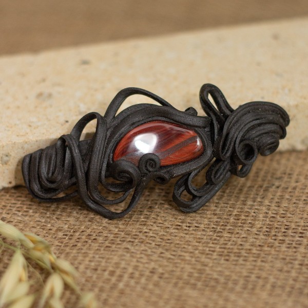 Spona do vlasů s červeným sklem z umělecké pryskyřice a kovovým mechanismem o velikosti 8cm. Celková velikost spony je přibližně 10cm.