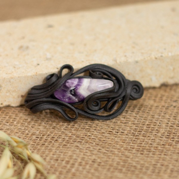 Spona do vlasů s obsidiánem z umělecké pryskyřice a kovovým mechanismem o velikosti 8cm. Celková velikost spony je přibližně 10cm.