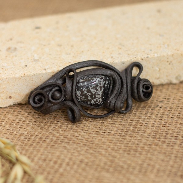 Spona do vlasů s ametystem z umělecké pryskyřice a kovovým mechanismem o velikosti 8cm. Celková velikost spony je přibližně 10cm.
